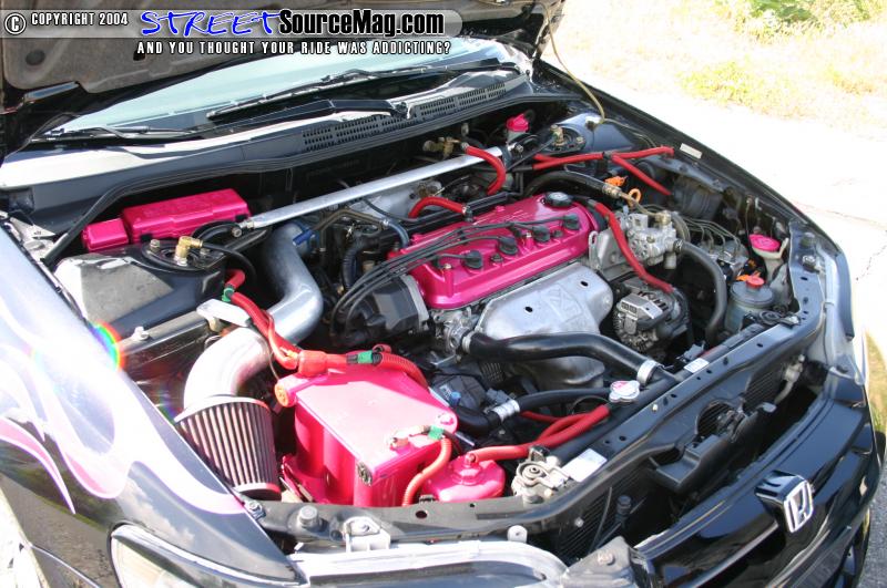 Under the hood sits a short ram intake, with a cone on the end of it. They also went the extra step and painted a few things pink including the valve cover, overflow, and Optima battery. If you look closer you can even see some wire loom. The loom is red though, not pink.