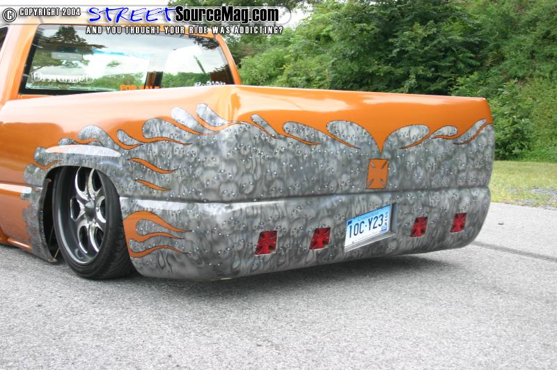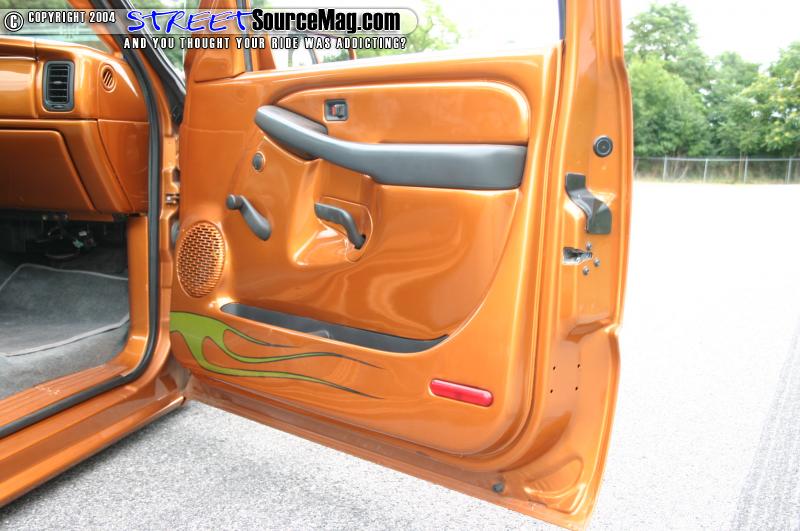 The interior features a painted dash, and painted door panels. The center console was smoothed and painted and the seats were swapped out for a set out of a 1997 S-10. Custom SS vents by CMC Metals were installed in the dash, along with a Trenz Billet mirror, and a Colorado Customs Steering wheel. The dash also houses the Pioneer CD player. Tom’s stereo consists of JL Components, a JL 10” sub, and JL Amp.