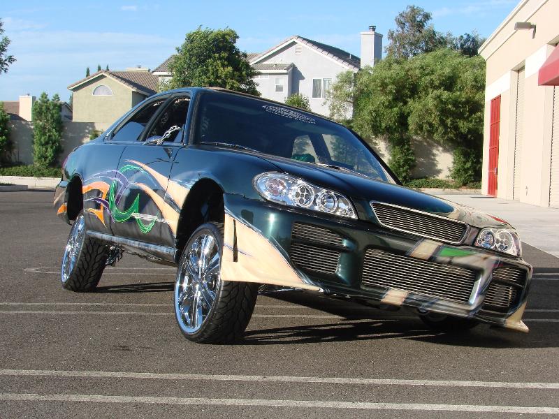 front end infiniti i30 headlight swap, bmw 5 series back end swap, motorized suicide hood and trunk, lambo front doors, and suicide lambo rear doors, shaved handles and moldings, custom made front bumper, custom cut billet grills. 35x40 street beat ragtop. redoing some shit.