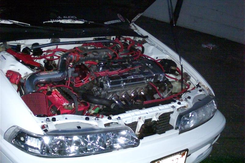 1.8l DOHC non-VTEC, Ractive header, ractive cat-back exhaust, ACT heavy duty clutch and light weight flywheel, AEM short ram intake, MSD red tinted clear modified dist cap, MSD blaster SS high output coil, accel thundersport red spark wires, NGK iridium plugs, chrome valve cover, Spoon Sports computer
