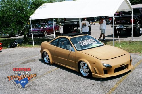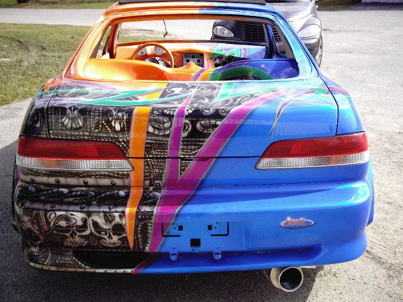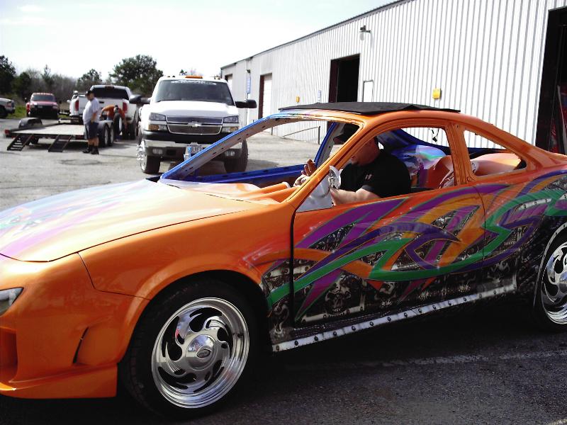 custom fender flares to tuck 20x8 in the rear, motorcycle headlight conversion, motorcycle gas cap, prelude tails, shaved out, sliding ragtop, side skirts molded into one piece. Chaotic Customs 281-290-6000