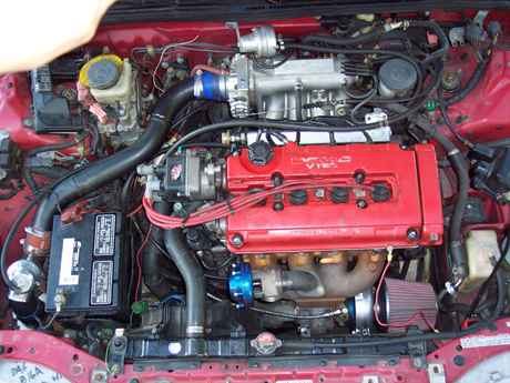 b17a, custom turbo kit[turbonetics t3t4], spearco intercooler, turbonetics wastegate, greddy blowoff valve, munuel boost control, jackson racing fmu, computer reprogrammed by mugeen, str competition fuel rail, 310 cc rc injectors, second jackson inline pump,web custom ground cams, type-r springs, titanium retainer, 70mm throttle body, port matched civic typr-r manifold, ls pistons[9:1 compression],new connecting rods, .040 over rod bearings, crank turned, block bored .030 over, lightened flywheel, clutchmasters stage 2 kevlar clutch rebuilt ys1 transmission, phantom grip limited slip, stage one axles, apexi vafc, greddy turbo timer and some other stuff im sure i forgot.