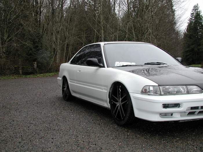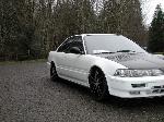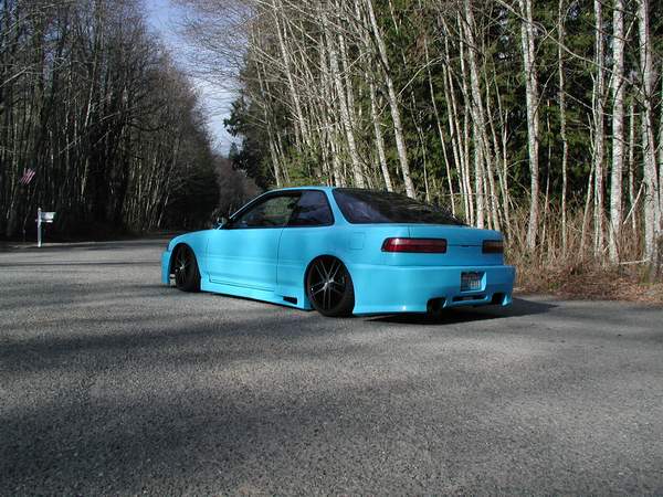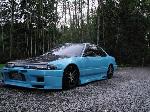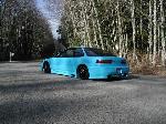 shaved side moldings, Shaved antenna, shaved window squiters, emblems, trunk key hole and door handles, carbon fiber hood and 1pc black housing projector headlights new custom blue paint job, R33 Skyline front, Urethane black widow sides and rear