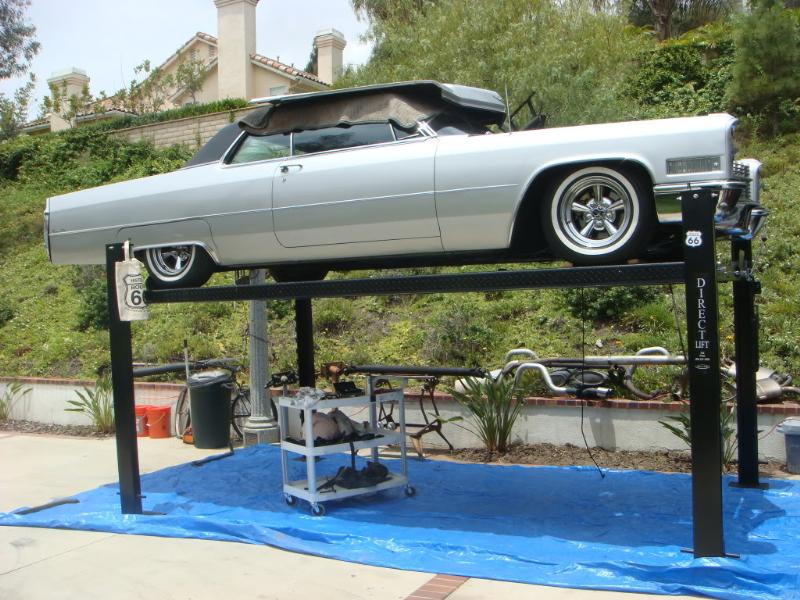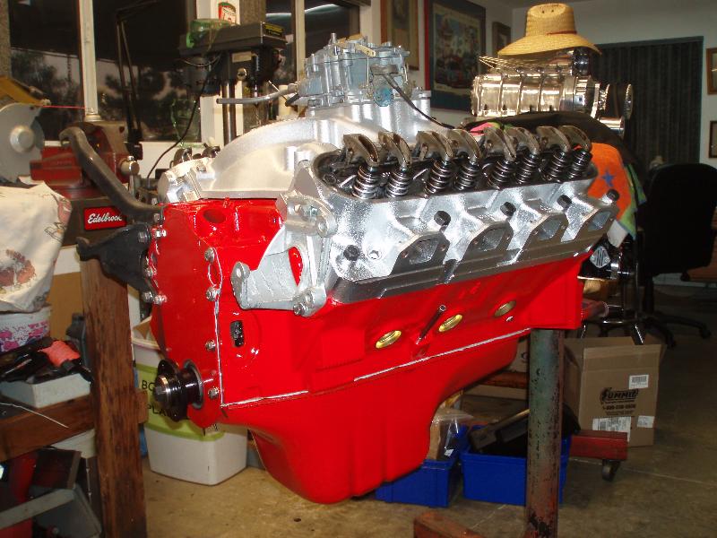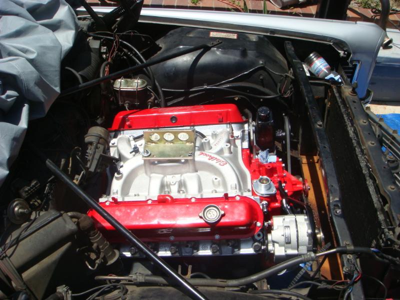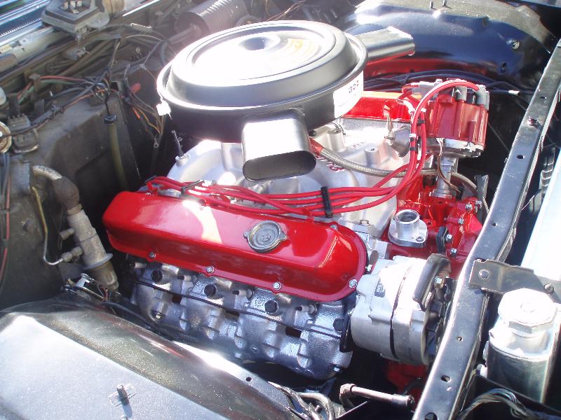 500 cubic inch Cadillac from a '70 Eldorado. 2" dual exhaust with bellflower tips