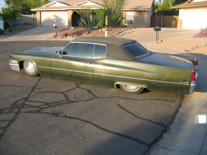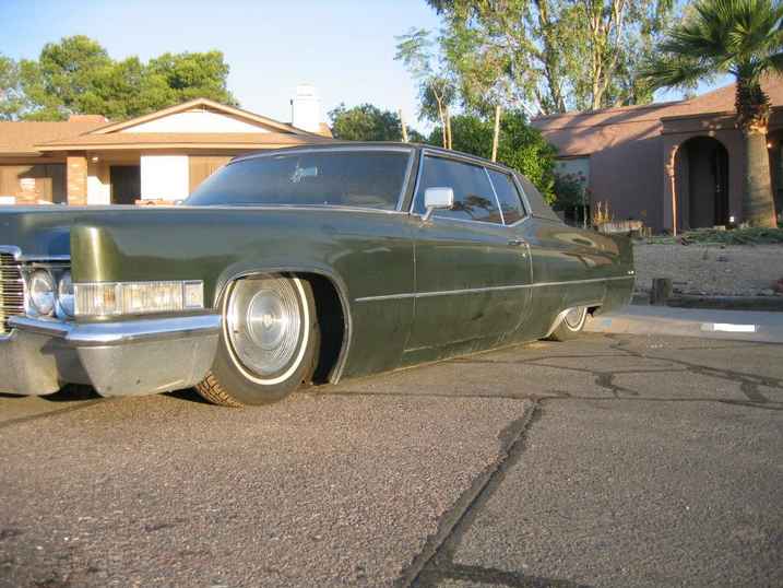 Shaved trim, fixed dents, new Range Rover metallic green with new black soft top.