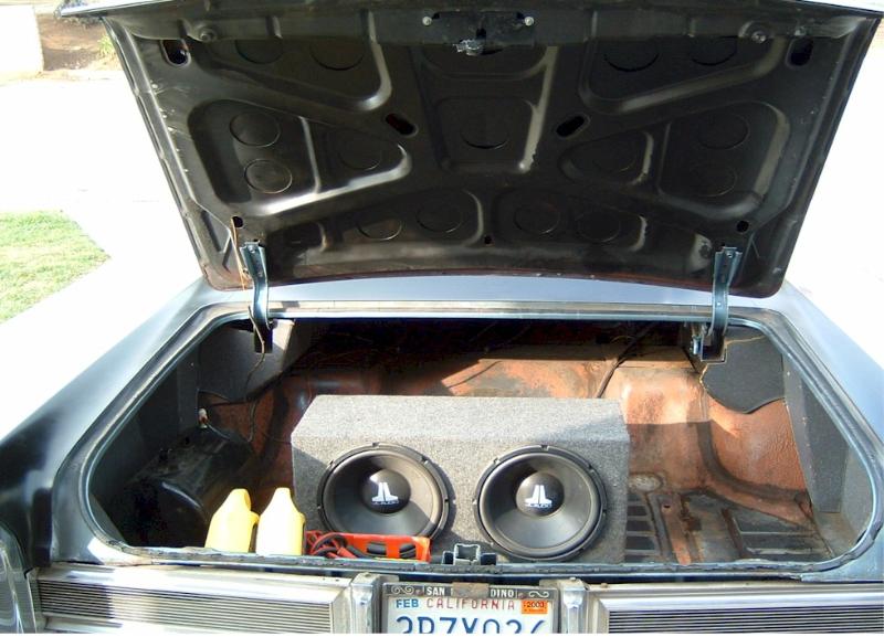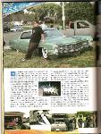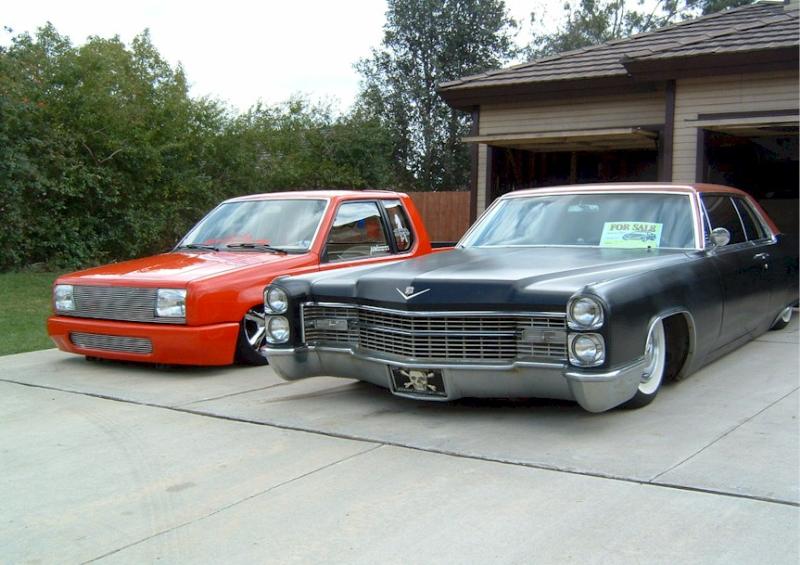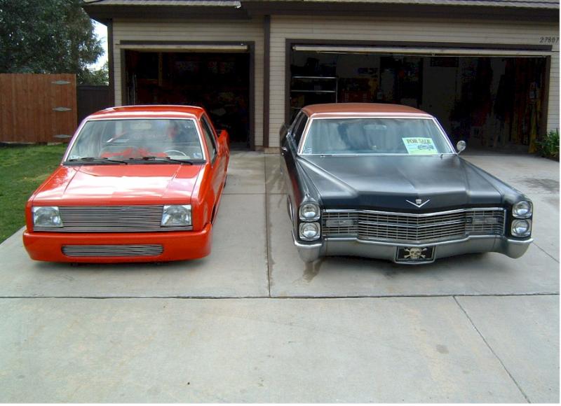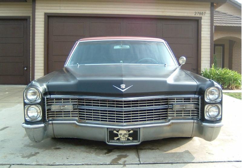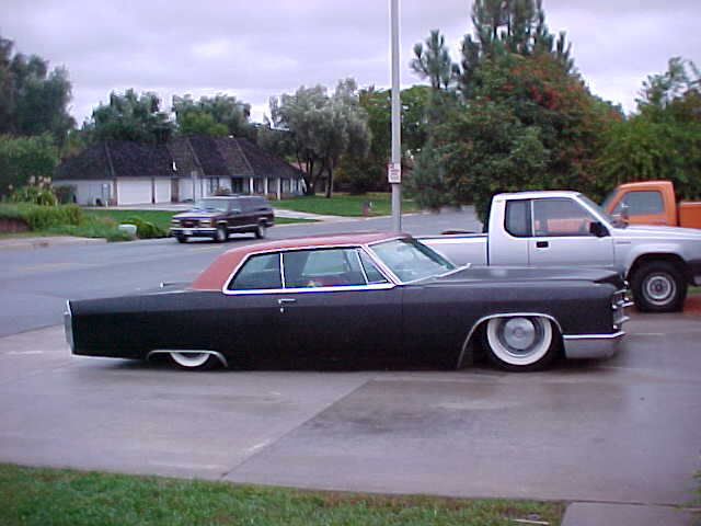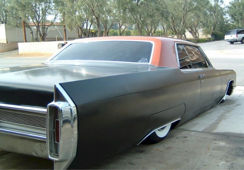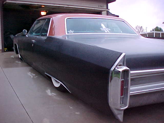 satin black using 99k shot by max at bio kustumz and me...well i just stood there and watched but i helped sand the big thing. the roof is painted some type of dodge orange wich had a lot of metallic then we shot some orange glitter over that and two coats of clear. REALLY SPARKLY. shaved corners, side chrome, antenna. It also sports the back of a sixty five caddy including the trunk, bumper and tailights..(NOT A BOLT ON) Bio Kustumz really had to do some modifying for it too fit.