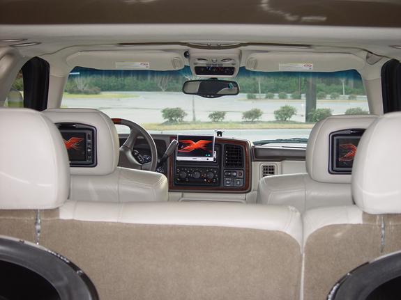 Audiobahn High Excursion 15's Four of them, being pushed by 2 Audiobahn High Current Amps and their pushing 2400 watts a piece. The box was custom built in about a week to build out of fiberglass. cd changer in console. 3 tv's