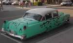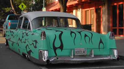 primer green body, white primer top, black primed flames. nosed, decked, shaved antenna and hood ornament as well as emblems and caddy insignias, nose pointed, hoodline removed, taken down to steel fully, all rust repaired.