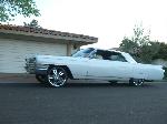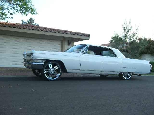 shaved the side emblems, front emblems, side moldings and door handles. Smoothed out the body and repainted in 2004 Cadillac Diamond White with a House of Kolors Ice Gold Pearl over it, MIPA clearcoat. All work done by Dunn-Rite Autobody in Las Vegas, NV. Engine compartment treated with Por-15 then Por-15 Black coat uv protectant. Pinstripped with really fine gold colored outline scallops on the sides, hood, trunk and roof by Wink of Boyd Coddington. Pinstripe pieces on the hood and trunk done by Tim in Las Vegas, NV. Entire underbody treated with Herculiner as well as the inner fender wells, then uv coated in gloss black. It now has painted underhood, control arms, frame rails etc. Old vacum canisters, windshield wiper motor, vacum plugs etc were removed from the firewall. Lite Glo provided a sealed beam conversion for the four headlights turning them into crystal h-4 housing's and Phillips provided their HID kit. Hood is on linear actuators (12" linear's from Spal) and controlled by Spal digital actuator controller. Spal door popers and helpers, trunk popper and hood popper