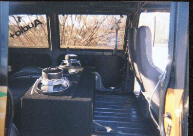 unfinished, but has tweed on the dash and front door panels with flames, billet specialties steering wheel to match wheels, rhino lined from the front seats back from floor to roof for stereo, and just added 2003 Toyota Sienna leather buckets, that I robbed for 30 BUCKS!?