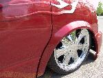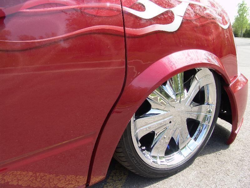 03 ESCALADE FRONT END 89 DEVILLE TAILLIGHTS SHAVED DOOR HANDLES AND GAS DOOR SMOOTH ROLL PAN TWO TONE RED PAINT WITH SILVER FLAME DONE BY MAD PROFESSOR CUSTOMS