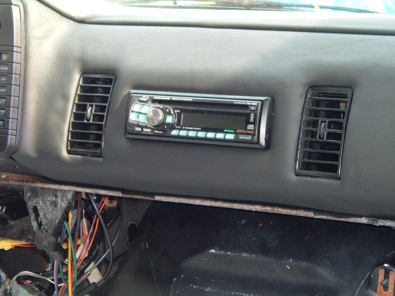 autometer american platinum gauges with the black bezels, custom shaved dash wrapped in plush fake leather, leather power seats out of something, custom door panels, everything custom wrapped