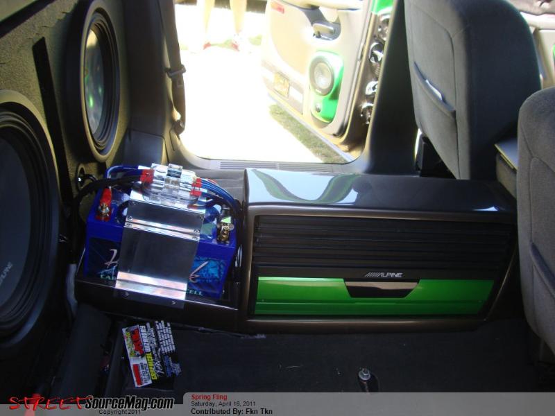 2- alpine 15" with 1000 watt alpine amps hooked to a alpine 7" indash touch screen tv powerd by a kenetic 2000 watt battery