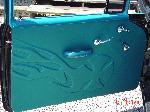 NO CROME , PAINTED BY ANTHONY AND ME AT OUR SHOP REEDS EARLY IRON . IT HAS A BLACK ON BOTTUM WITH A SEA FOAM GREEN ON TOP IT IS A SHERWIN WILLIAMS BASE AND HOUSE OF COLOR CLEAR ON TOP . IT HAS A PURPLE PIN STRIP BETWEEN THE TWO . ON THE TRUNK IT HAS DUPOINTS CRHOMALUSION AND A MIX OF R&M EXTREME FLAMES AND CROSS .