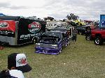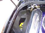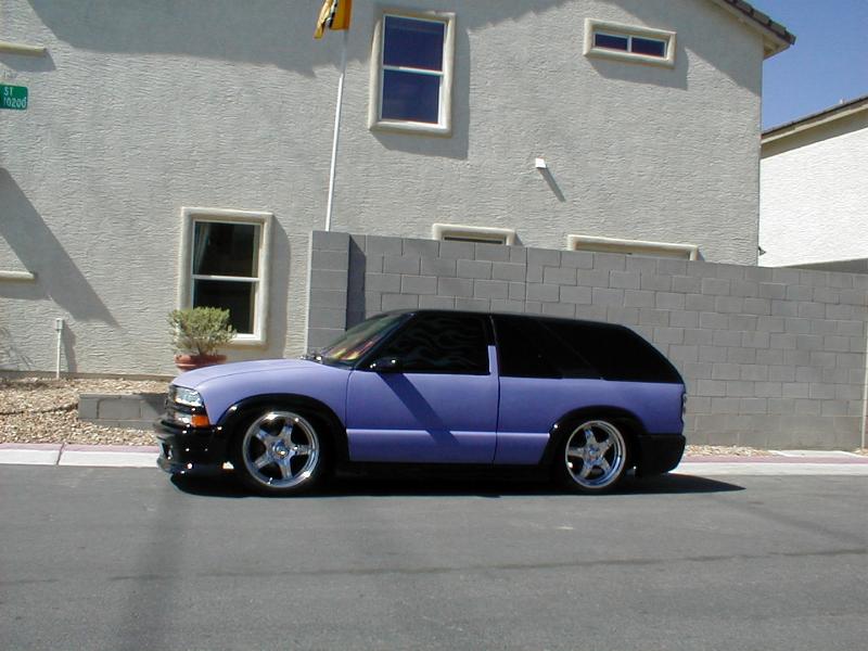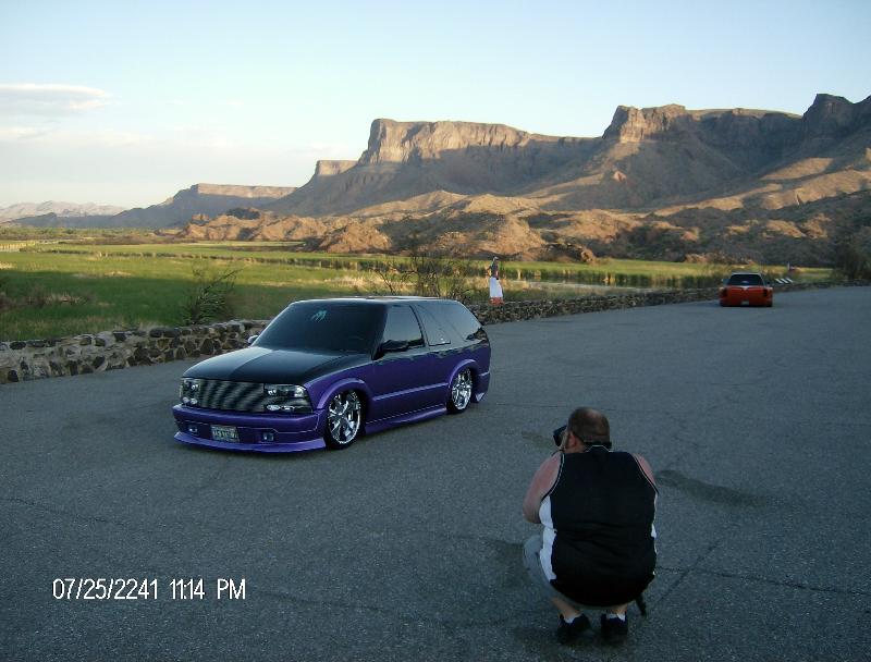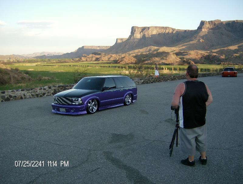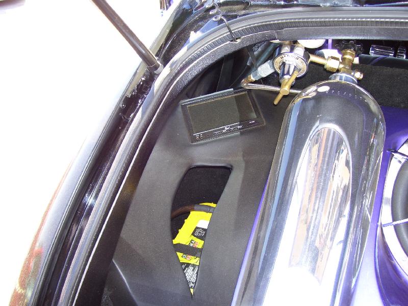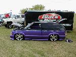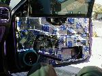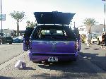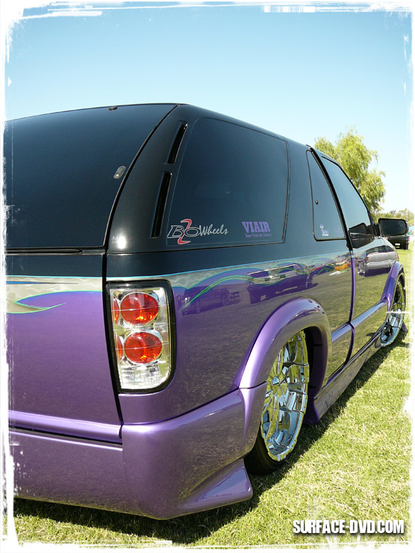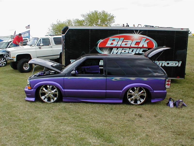 Billet Steering wheel form Kustom Kreationz, polished bezel, stainless gauges, polished flamed pedals ... Complete interior Black vynal and leather and violet tweed, fiberglass shaved doors skins, Molded facia tv, floor, seats with flames, shaved dash, head linner, everything even seat belts.., nobs, center council, extinguishers, Custom fiber glass enclosure. Painted 8 gallon expansion tank. Tailgate with amp molded in, 2-7 inch TV's in the rear, one 15.6 inch flip down, and 2 7 inch visor monitors with rear view mirror monitor. Tons of vibration control by FATMAT visit them at www.fatmat.com, way better than dynamat.