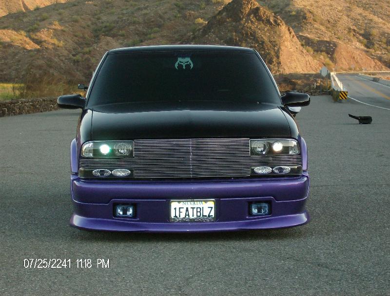 Full Face Billet grill, Paint: custom violet and black two tone with silver, charcoal, true blue, frost charcoal, money green stipe, and different violets, Real HUNDRED DOLLAR BILL IN paint by Musso Motorsports, graphics BY KAOTIC (ryan) clear with an Violet ice pearl!!!