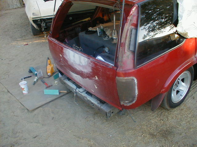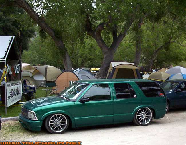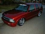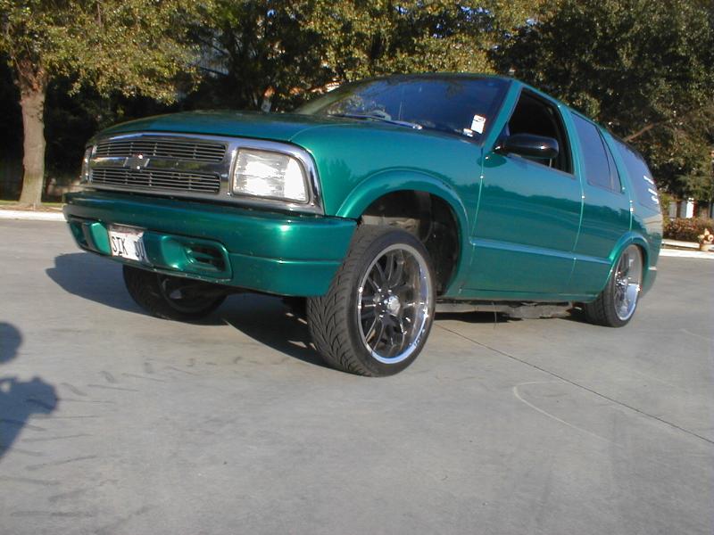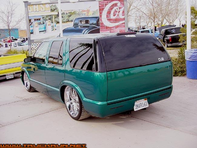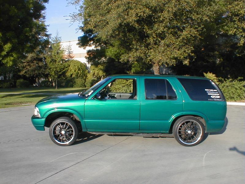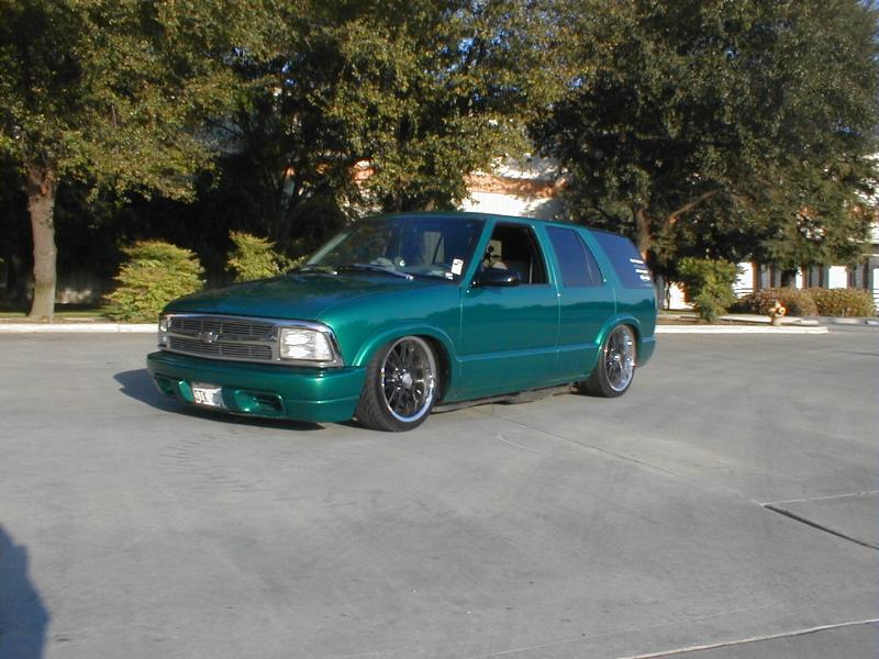 shaved door handles,antenna,hood squirters,gas door,tailights,rear wiper,rear lock,roof rack,(basically everything that wasn't needed)removed rear bumper and added an F.B.I. S-10 rollpan with LED tailights. Thanks to Central Valley Customs(559)287-6380 for the paint and bodywork.98 s-10 front bumper, billet grille,door poppers installed by Autotronix(now AVS), just installed 12 channel remote box to open doors and can control airbags with remote, and airhorn.
