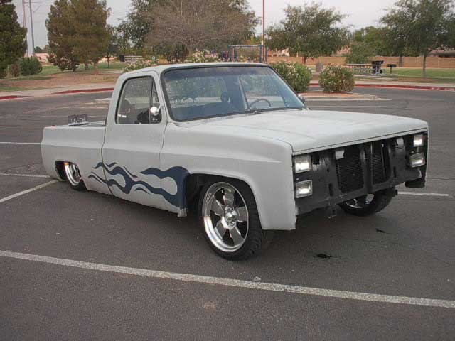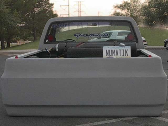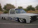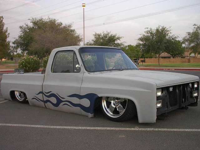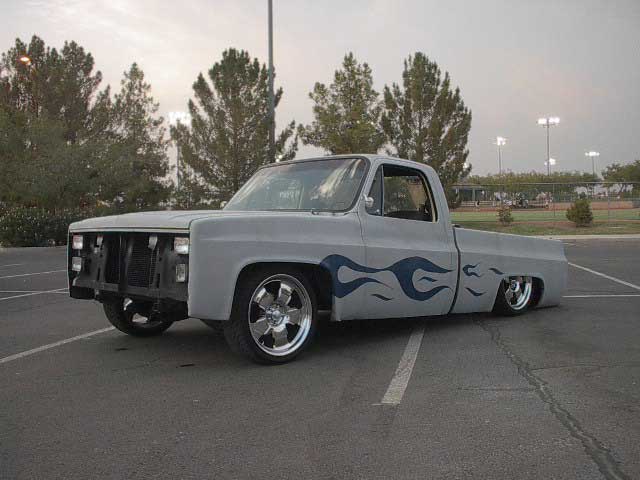 2600lb Firestone Bags, bodydropped the cab 6” and the bed floor 14”. A full custom four linked rear end on a cantilever system was also fabricated.