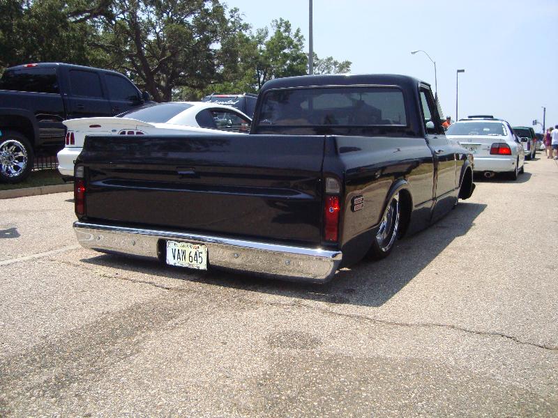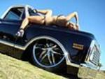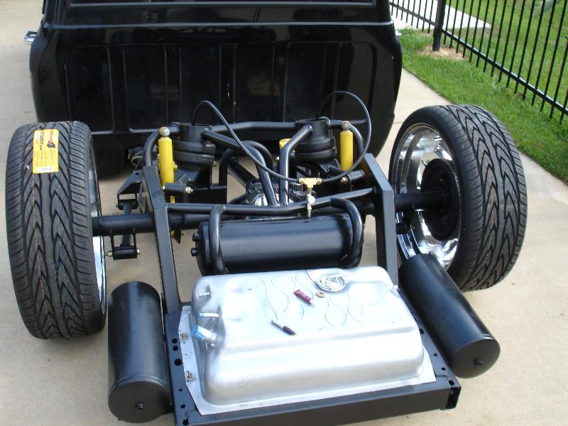 Porterbuilt Streetrods cross member, Air Ride control arms, RE-7 Slams all around, 3/8 Air Lift Chrome valves, custom 4-Link and bridge.