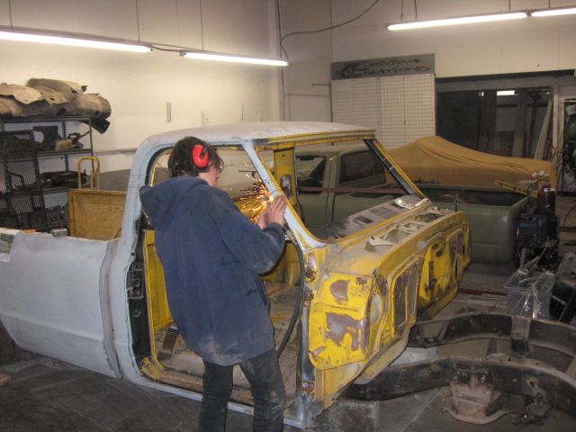 '67 clip w/ '69 hood, baby blue paint, custom tube chassis, BonSpeed Malibu's, Lincoln Interior, sheet metal bed.