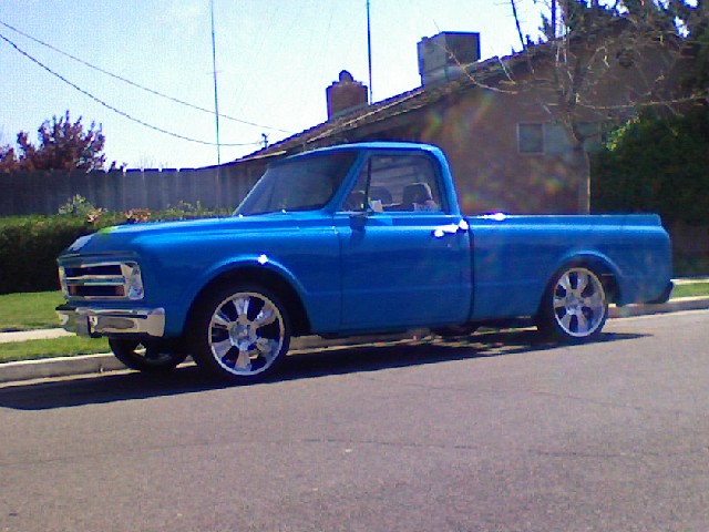 The suspension was done by several buddies of mine. They fabbed up a cantilever setup in the rear with the kp monster notches. i have two Vair comps, 1 6-gallon airtank, 8- 1/2" SMC valves, with a ten switch box. I also have 2 1/2 drop spindles. I have 2600 lbs bags all round.