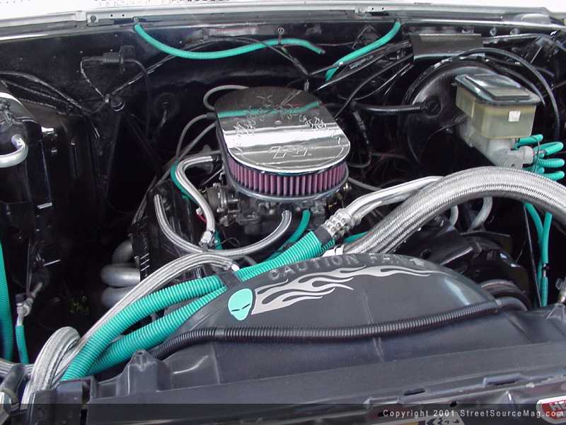 350 WITH PERMASTAR COATED EDELBROCK PERFORMER INATKE MANIFOLD. HOLLEY CARB. K&N FLAMED AIR CLEANER.BILLET FLAMED VALVE COVERS. LOTS OF CHROME, POLISH AND PAINT. 3 1/2" STAINLESS EXHAUST. FLOWMASTERS.