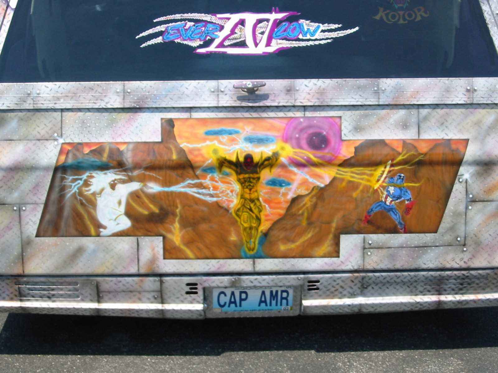 White with Silver pearl violt marbelizer and diamond tread air brush work.Also two Captian America murals.