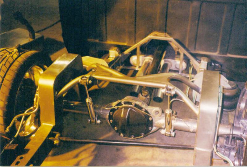 Bagged, fast valves, all stainless hardline, Lifted front crossmember and bag mounts to layframe, the cab is not bodydropped, The truck lays Rockers, the frame is not cut down, stock floor, lowered cab mounts, tunneld cab for trans. Back is 2-linked