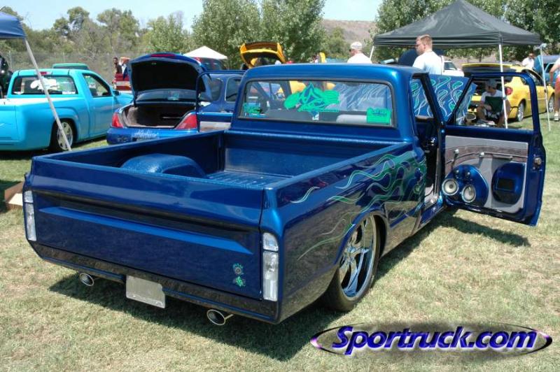 shaved molding, roof seam, door handles, gas filler, tailgate handle, marker lights painted chevy arrival metallic blue with candy green flames and skulls ghosted in in the green