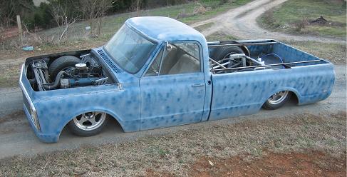 gray primer & blue guide coat w/ fenders molded to front roll pan and cowl vent. Shaved:tailgate, emblems, mirrors, cab seam, stake pockets, marker lights, moldings, antenna and drip rails. Billet grill,w/ turn signals behind grill, billet hood pins, clear tailights a chrome peep mirror at the top of the door.