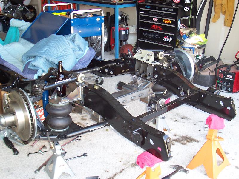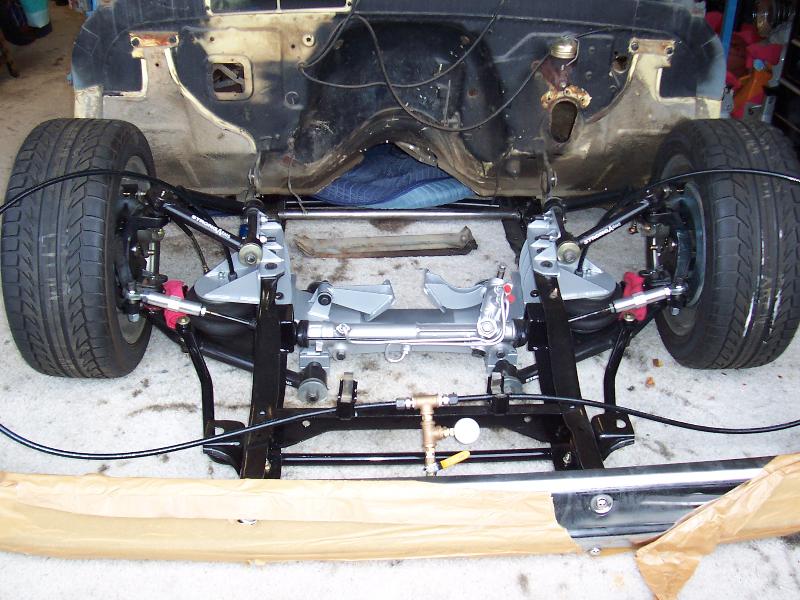 porterbuilt front xmember, mustang rack,ART upper and lower arms, bags, front disc kit, rear bagged with disc brakes,fully built rearend with a 3:73 posi with 5x5 axles, stainless panhard bar, everything stainless hardlines air,fuel,brakes, por-15 frame and xmembers, aluminum fuel cell in rails,1 1/8 front sway bar