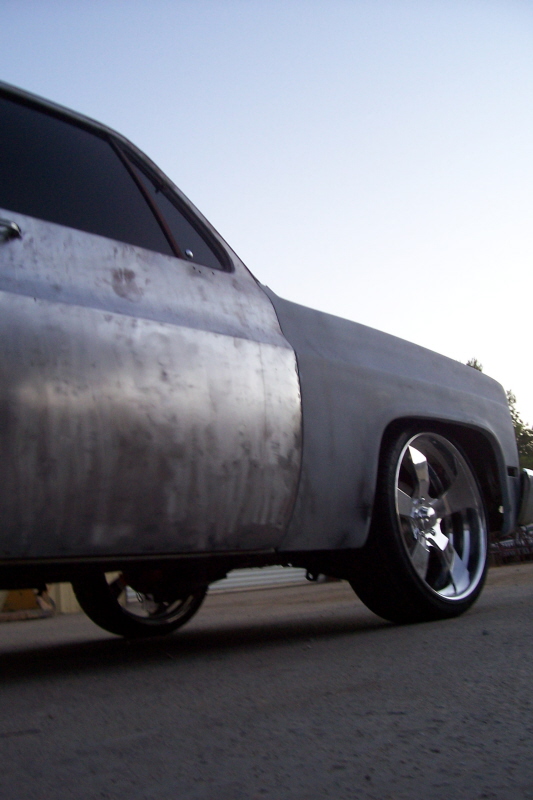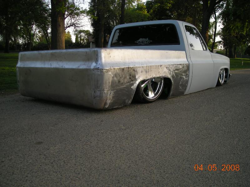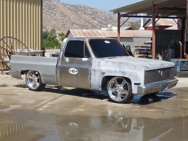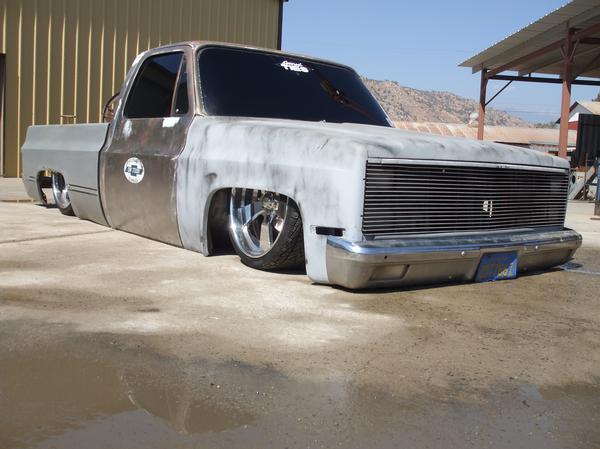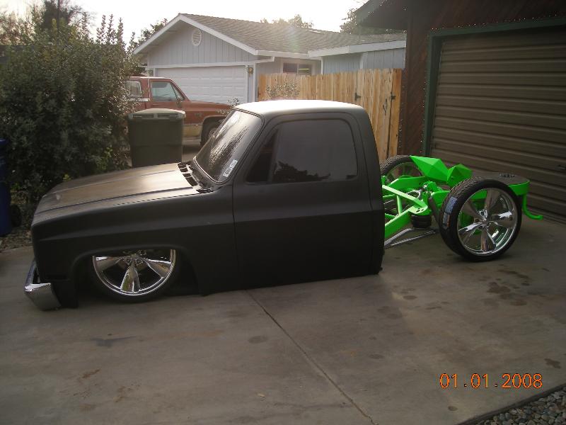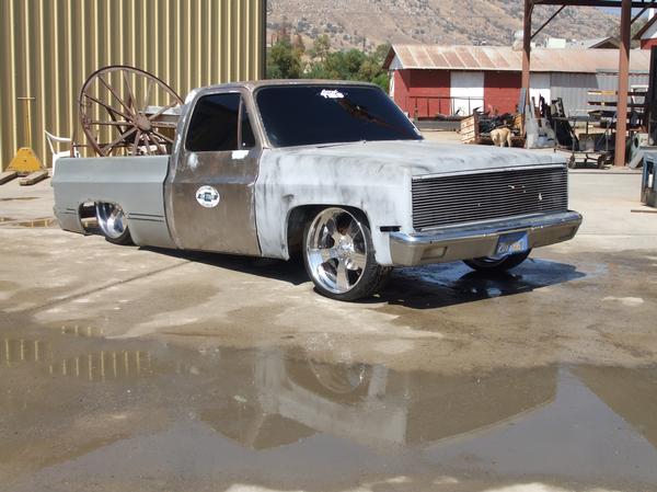 BodyDrop on 22's, shave it all up, paint frame shave firewall, sheetmetal bed, slap crate 350 in it you know just re-do her totally. Keep checking in for updates.