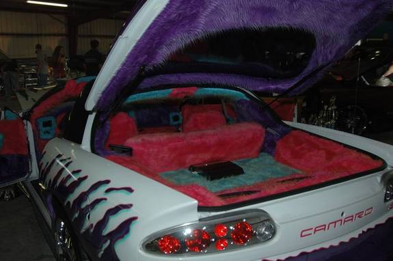 Full interior covered in Pink, Purple, and Teal Funky Fur material. Everything covered, floor, seats, headliner, trunk, doors, dash, center console, and all other panels