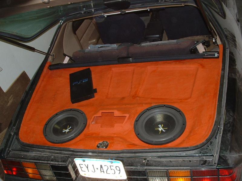 2 12" DEI Comp-X's in 100% custom fiberglass set-up made by me, Factory modded 1500 watt RMS Crossfire Amp 1 OHM, PS2, Alpine flip-out head unit, Alpine GPS & separate TV, fiberglass door panels with 199 model MB Quartz, Audiobahn kickpanels