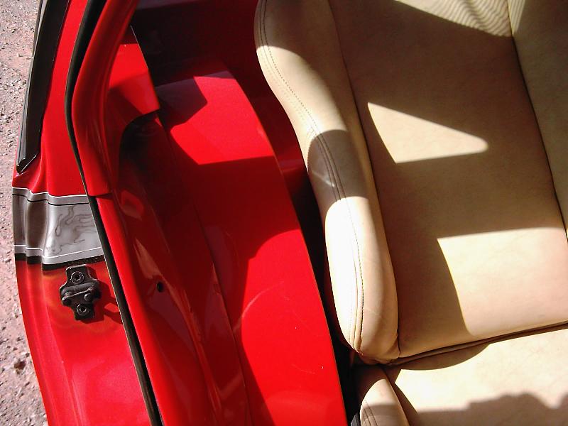 B.A.D. Hellfire wheel and flamed billet rear view mirror. Four 3-A racing bucket seats wrapped in "bone" vinyl. Sheet metal dash and rear section and console. Relocated window switches.