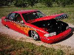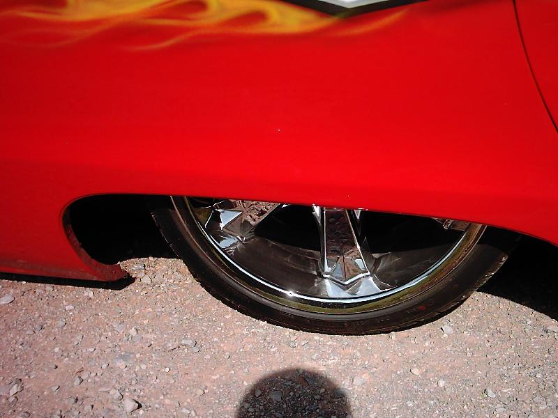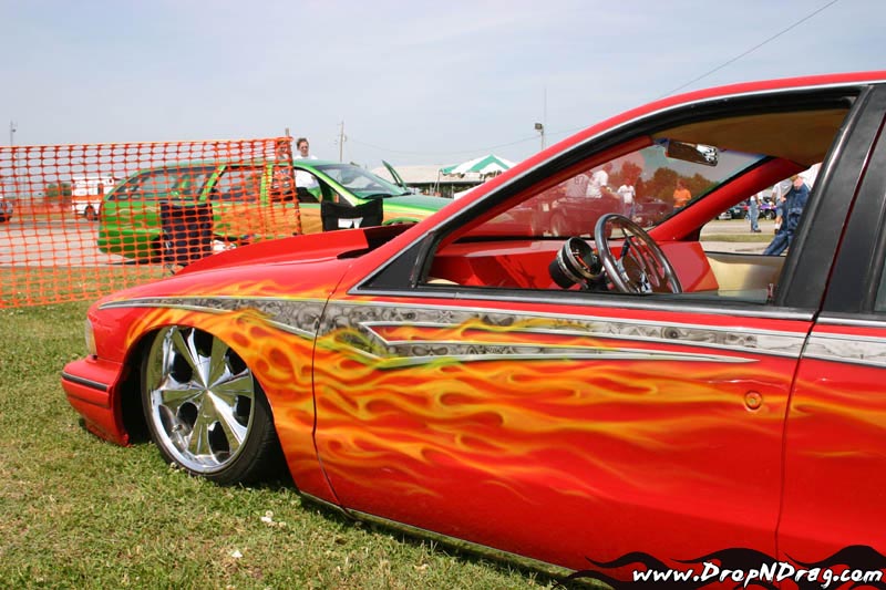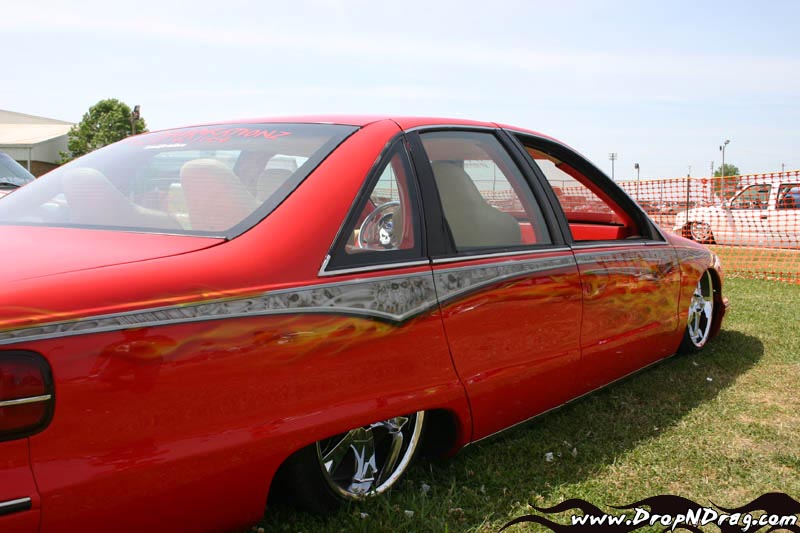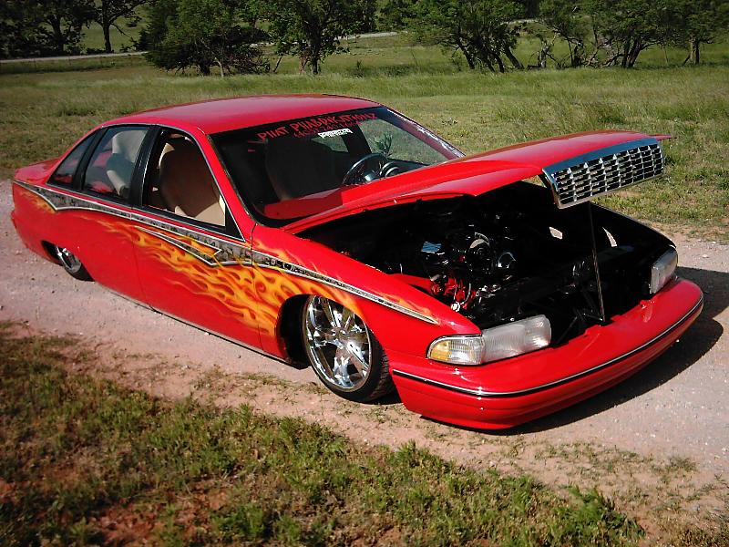 Now body dropped 3.25 inches. Lays all 4 doors. Shaved handles, mirrors, antannae, hood ornament, Torch red with airbrushed chrome molding and airbrushed graphics including skulls, titties, ass, and pussy done by Derek Holder at Creative Customs in OKC. Also custom made cowl hood.