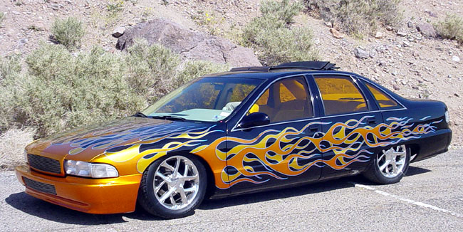 8 Gallons of Dupont clear and days of color sanding. Deeply buried Kandy flames (House of Color custom mix) these flames jumpout at you in the daylight.Door jams are equally as nice. Shaved deck lid, Fiberglass front and rear bumper covers w/billet inserts. Fold back canvas sunroof.