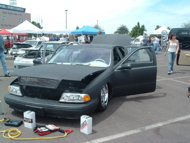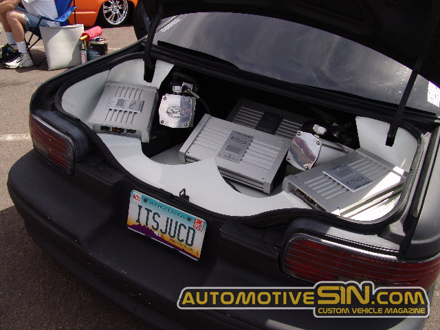 8 NICHE AUDIO TEN INCH SUBS INSIDE THE CAR. 4 ARE IN A CUSTOM FIBERGLASS ENCLOSURE THAT IS FIXED INTO THE REAR DECK, THE OTHER 4 ARE DOWN A CUSTOM CENTER CONSOLE THAT EXTENDS FROM THE REAR DECK ALL THE WAY UP TO THE DASH. 8 NICHE AUDIO 6.5" COMPONENTS IN THE DOORS, 2 NICHE AUDIO 3000D AND 2 NICHE AUDIO 60.4C AMPLIFIERS IN THE TRUNK WITH A CUSTOM BUILT FIBERGLASS TUB SURROUNDING THE AMPS AND PUMPS, PIONEER AVH-P6500DVD IN DASH TV/ DVD PLAYER, AND TWO OPTIMA RED TOP GROUP 34 BATTERIES, AND ALL MONSTER PERFORMANCE CAR WIRING, RCAS, DISTRIBUTION BLOCKS, BATTERY CONECTORS, ETC....