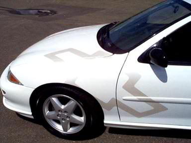 Shaved all emblems, put a big-ass silver pearl bowtie on each side of the car.