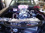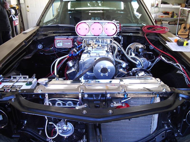 Merlin stage 1 572 Big Block with a Weiand 8-71 Blower, show quality polished nitrous system. Brodix BB2 Extra Aluminum firebreathing heads, JE 8.7:1 forced induction pistons, Eagle forged H-Beam connecting rods, Bullet custom blower camshaft, Comp Cams Pro Magnum roller rockers, comp cams pushrods, Jegs aluminum roller rocker stud girdel, dual Demon 850cfm 4-barrel blower carbs, pete jackson gear drive timing, CSI flexplate, CSI silver anodized electric water pump, custom headers, MSD 6BTM electronic ignition with MSD Blaster coil, MSD pro-billet distributor, aeromotive eliminator electric fuel pump, SSBC chrome brake booster with master cylinder, Strange solid spool 3.70 rear end