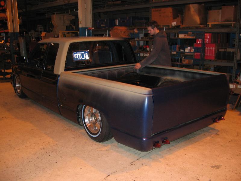 Molded roll pan with four frenched 59' caddy tails in it, shaved taillights, shaved tailgate handle, shaved antena, boxed frame supports from notch back.