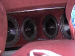 4 15 in subs with a cut threw bed an cab line x box an bed to keep the rain out 2400 watt sub amp 1000 watts tweets an mids bass amp