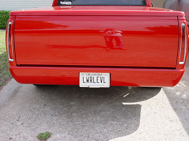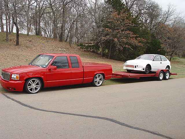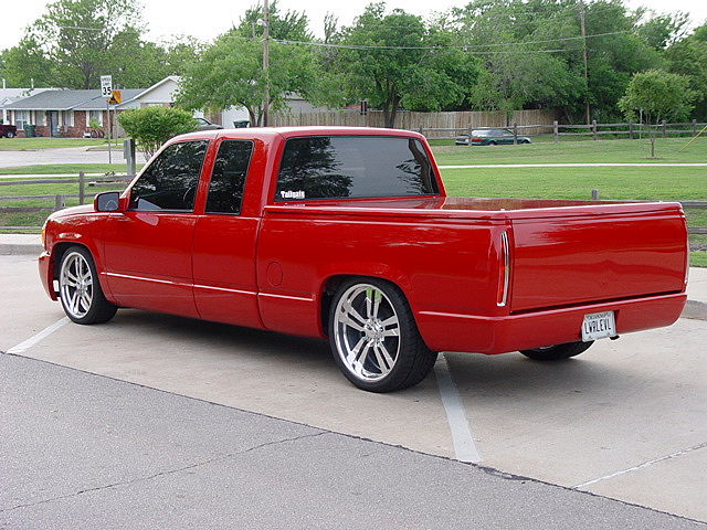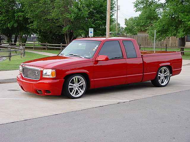 97 sedan DeVille Caddy tail lights, molded roll-pan, shaved handles, antenna, tailgate handle. 199 Cadillac Escalade front clip, chrome tow hooks, Pro Designs custom grill, snug-lid, diamond plate bed floor
