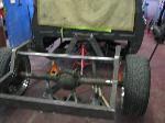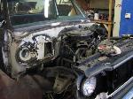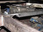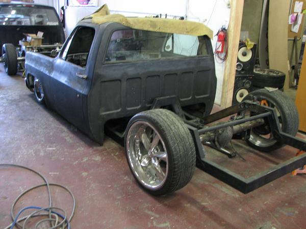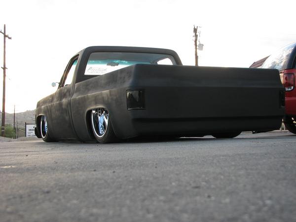 stock floored on 22s custom 3/4 frame, laying on stock control arms with drop spindles, contitech bags in front air lift dominators in the rear. custom tigged and built lower link bars. raised bed floor.