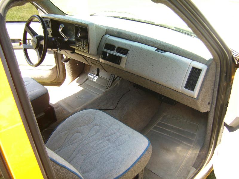 ppg chrome yellow with custom rock chips, ws6 hood, cat eye grille with speed grille insert, all clear lights up front, smoothie bumper, shaved tailights,tailgate, and rollpan with 10" leds