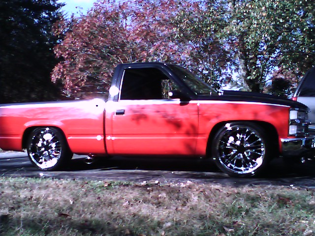custom red and black. custom console with a solo-baric L7 15 shoved in between two bucket seats that were moved over to fit the sub and console. seat belts are 4point harneses that hold you in when you are haullin ass. the entire sound system is kicker. i plan to port the bed and add 2 more 15s in the bed to let every one know im cominmg.
