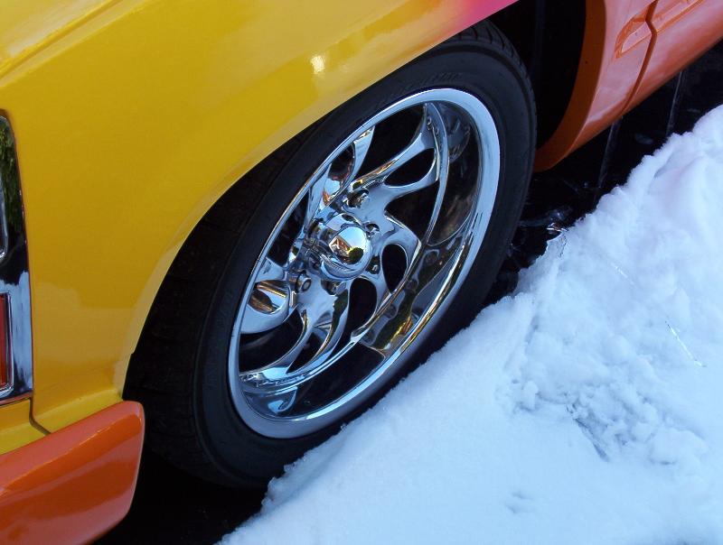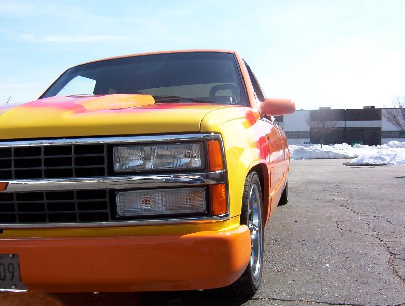 Clean and Shaved. Lowered 5/7". PPG Tangelo Orange with Custom Flames outlined in PPG Royal Blue.