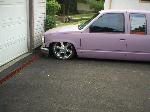 purple primer with shaved passengers side door handle.. no tailgate rollpan, dent in left front fender and rear quarter on passengers side