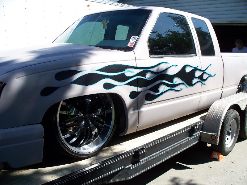 2004 front end swap shaved taligate handle,stake pockets thrid brake light,17 gal fuel cell put new cross member in powder coated drop spindles,brake drums,air cleaner battery holder,spikes,anything else thats blue on the truck.