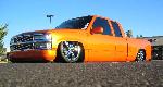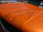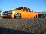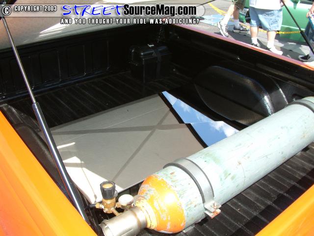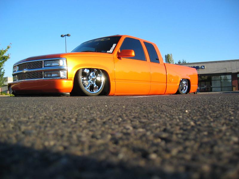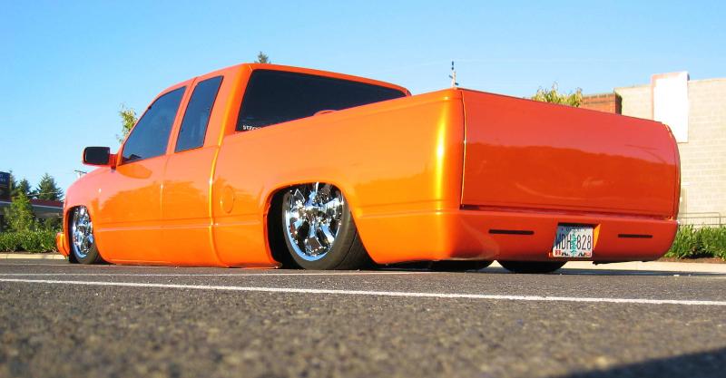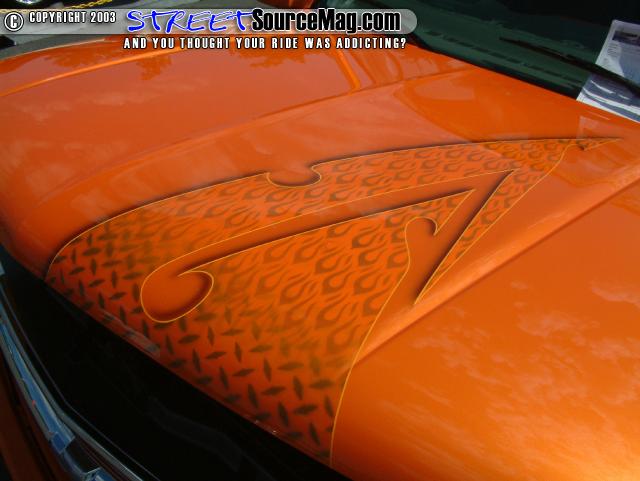 Shaved Everything, Sikkens Lamborghini Orange Pearl, Custom Graphics on the hood, LED Tail lights in the roll pan, French License Plate, Rag Top.